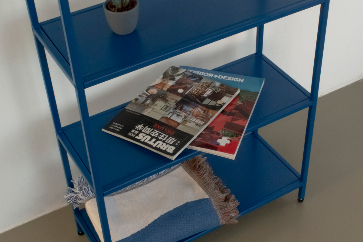 Синий цвет добавляет глубины и спокойствия и работает как самостоятельный акцент в интерьере, особенно в сочетании с нейтральными стенами и натуральными материалами. Простая форма делает стеллаж универсальным: он не спорит с предметами, а аккуратно их подчёркивает.
